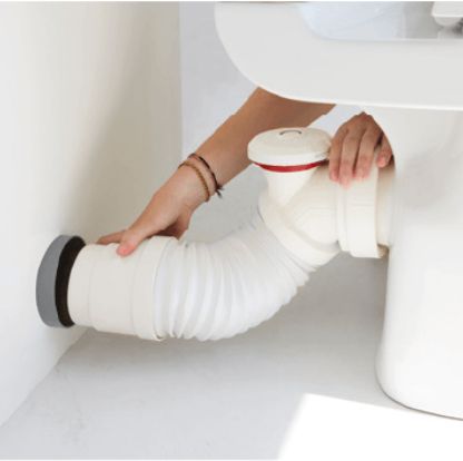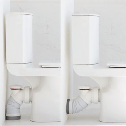 2-IN-1 WC pan connector with an integrated air admittance valve that drains and ventilates pipes preventing drain smells.